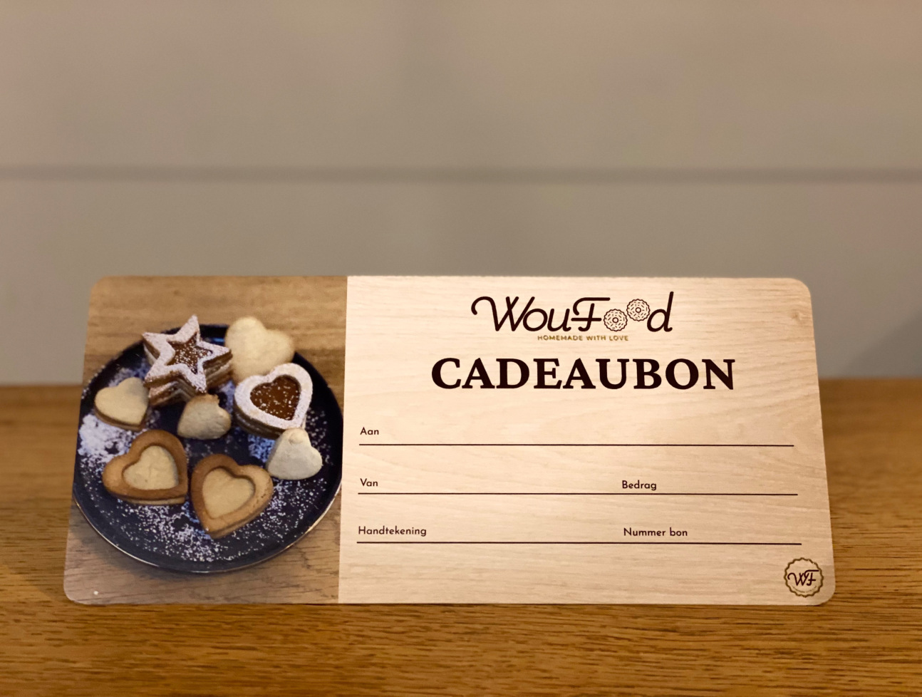 De ontvanger kan de cadeaubon inwisselen voor hun favoriete koekjes bij Woufood.